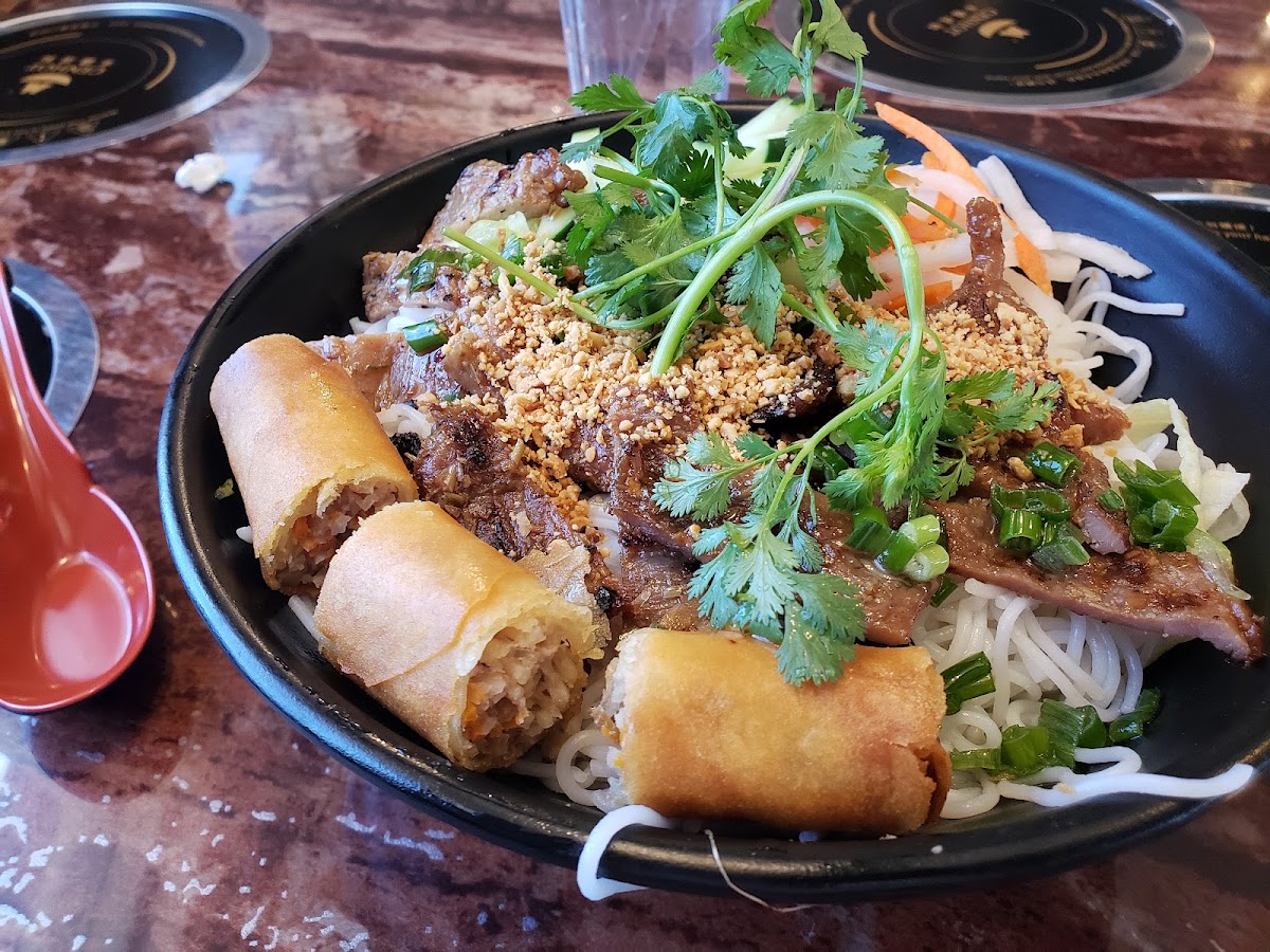 Bun Thit Nuong with Egg Roll: This dish features a hearty serving of vermicelli noodles topped with grilled pork and a crispy egg roll. It's an excellent choice for anyone craving a well-balanced meal.