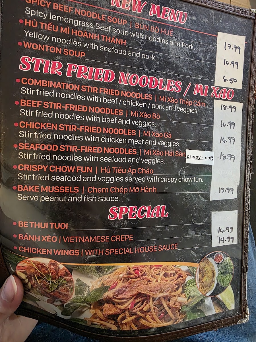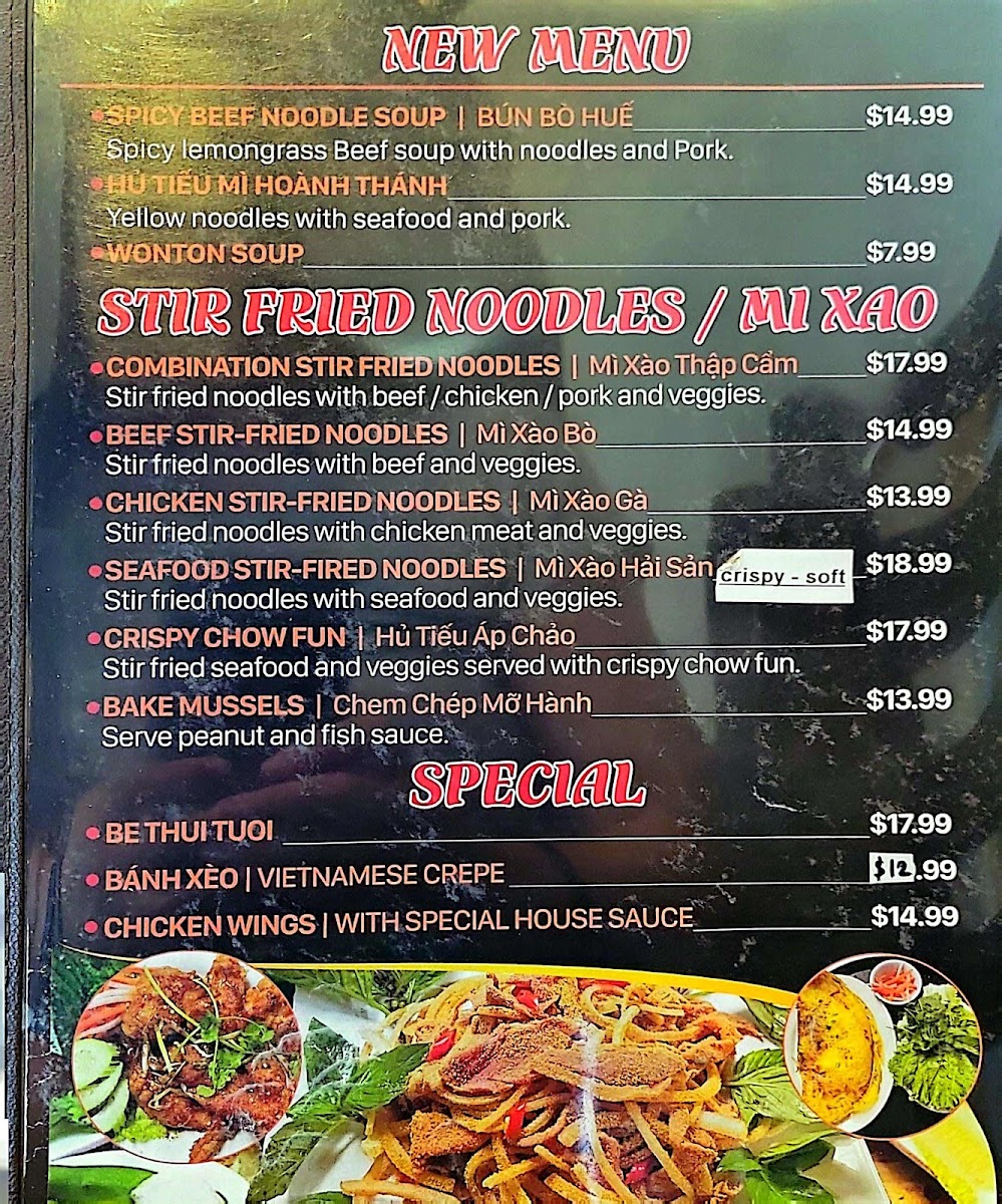 Hủ Tiếu Áp Chảo Stir fried seafood and veggies served with crispy chow fun.
