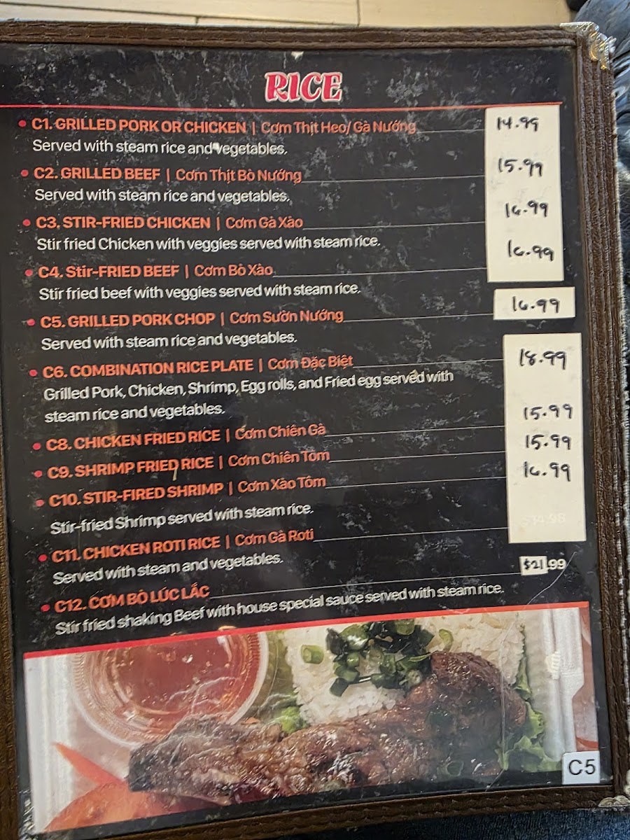 Cơm Đặc Biệt Grilled pork, chicken, shrimp, egg rolls, and fried egg served with steam rice and vegetables.